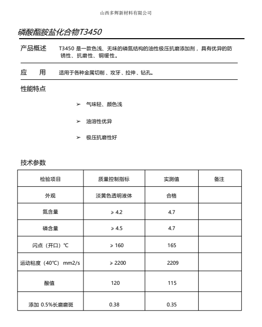 產(chǎn)品概述:T3450 是一款色淺、無味的磷氮結(jié)構(gòu)的油性極壓抗磨添加劑,具有優(yōu)異的防銹性’抗磨性‘銅緩性’